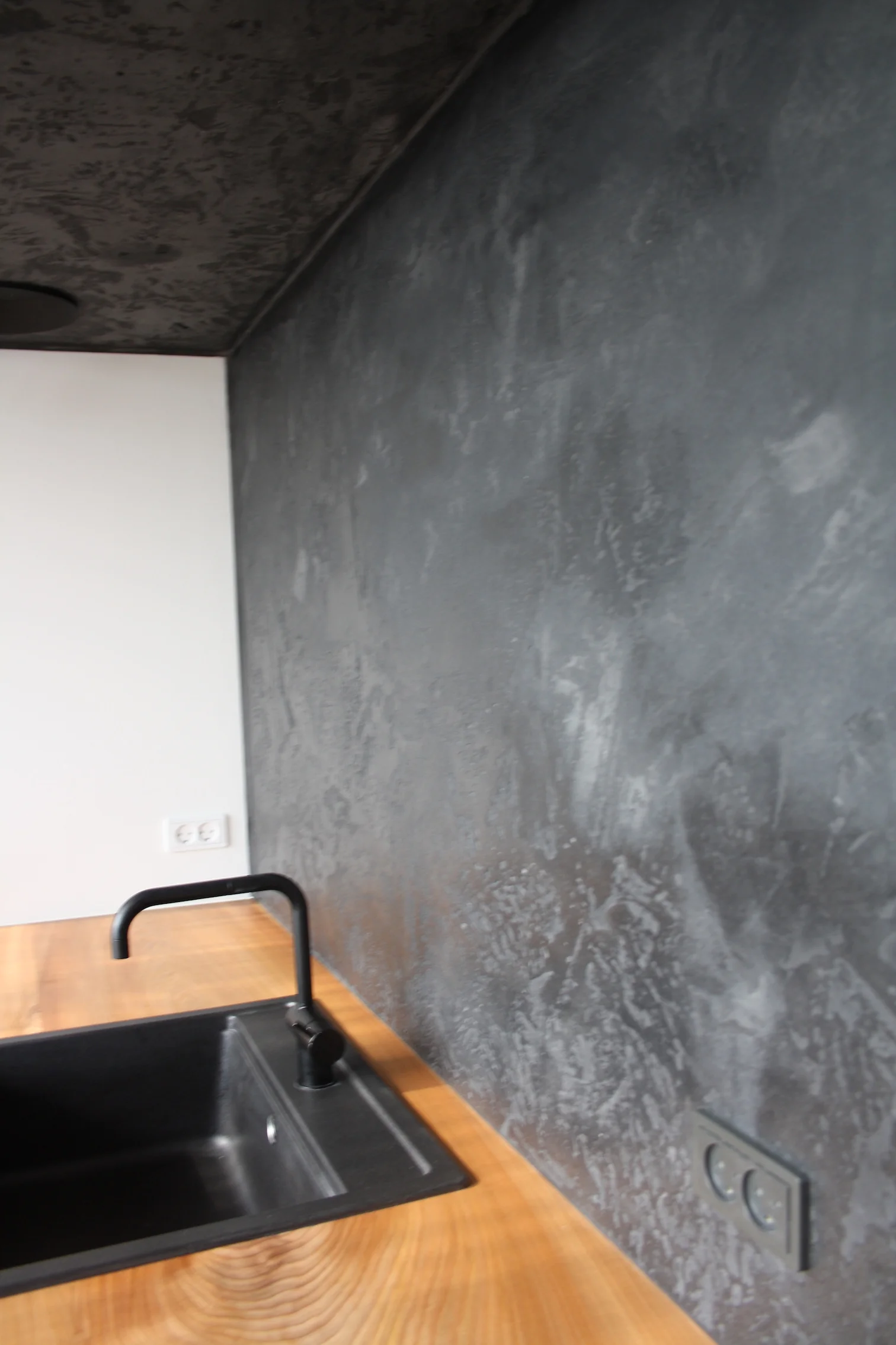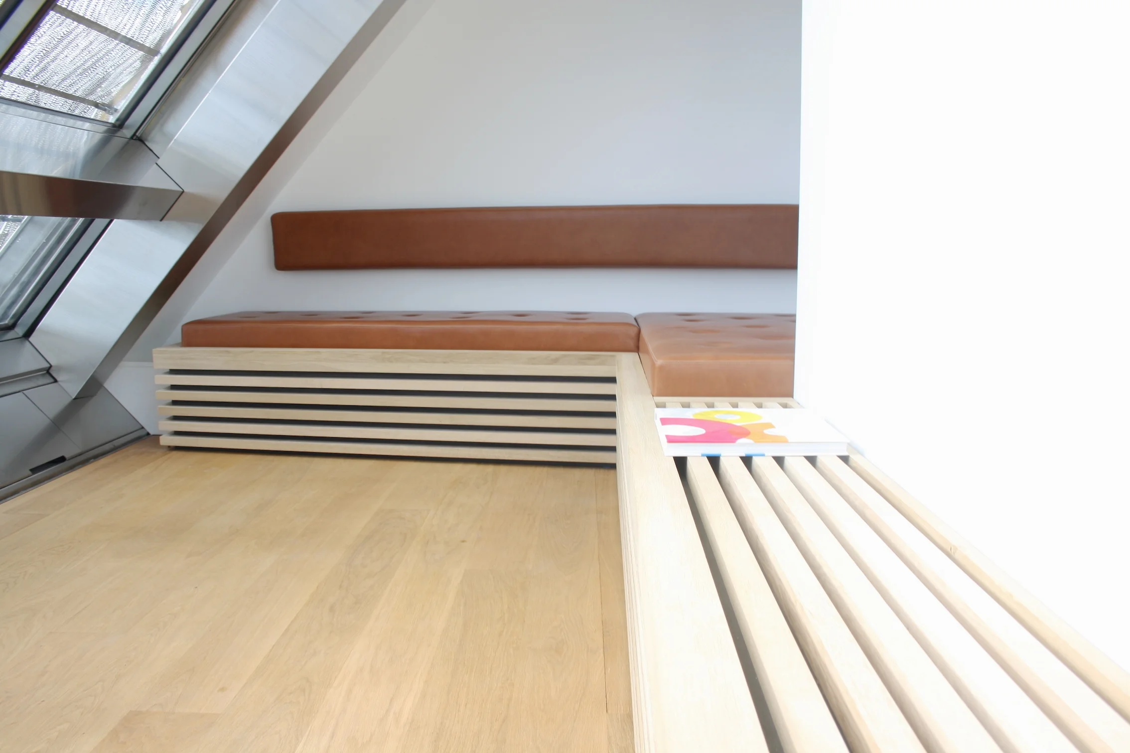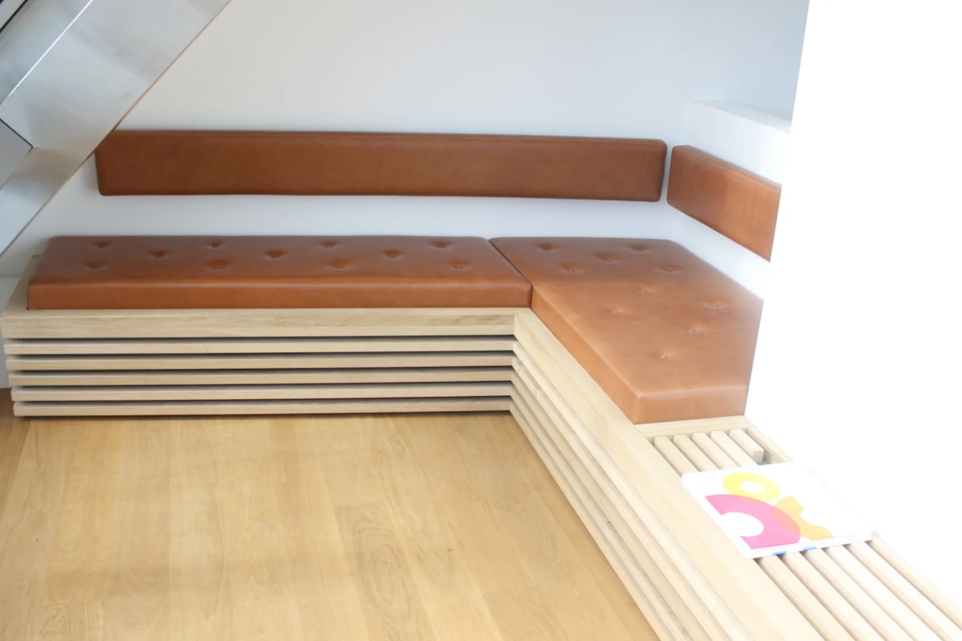 Elementer i massiv elme træ og skifer puds. Indbygget sofa og langborde i massiv eg