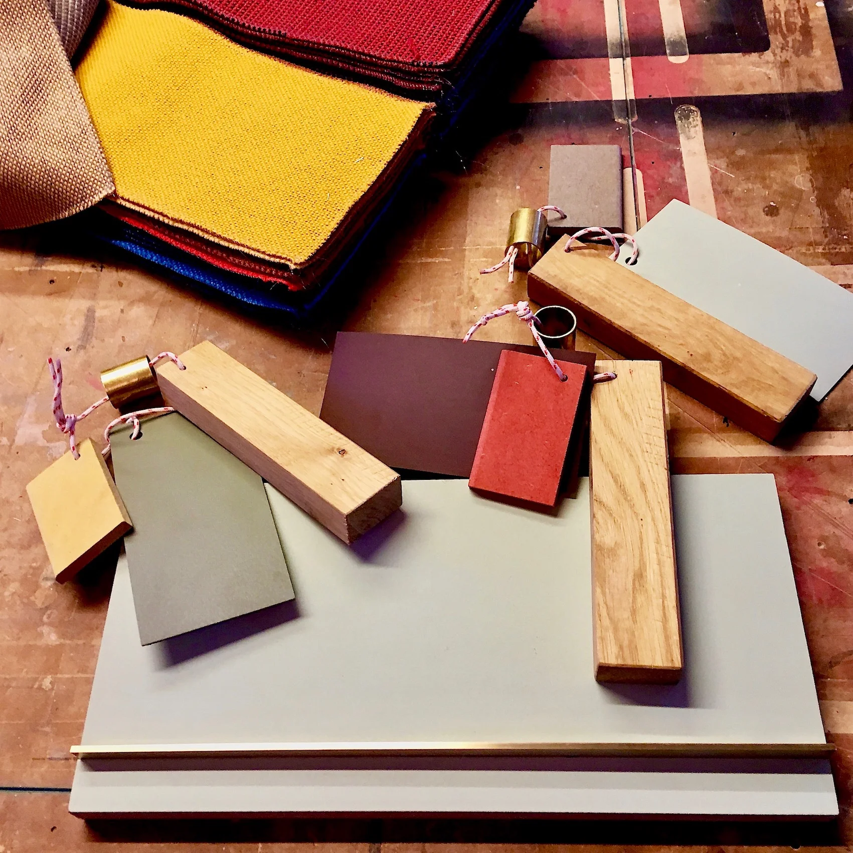 Elementer i massiv eg, designboard, furniture linoleum og messing
